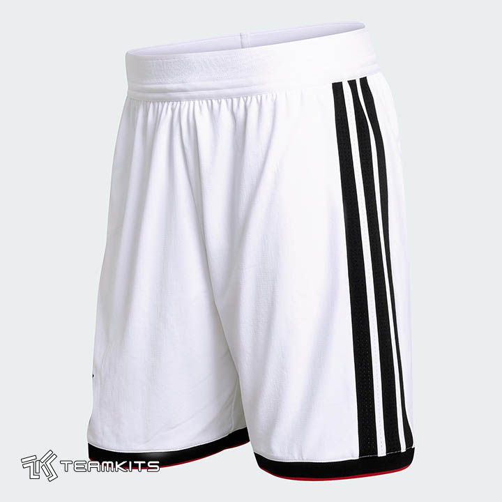 لوگوی فدراسیون فوتبال آلمان و آدیداس در دو سمت بر روی این نوارها جانمایی شده و سه خط پهن مشکی بر روی شانه و نوار لبه آستین نیز مشکی با حاشیه قرمر کار شده است. شورت مشکی و جوراب سفید با نوارهای سه رنگ پرچم آلمان همانند پیراهن ترکیب لباس اول آلمان در سال ۲۰۲۶ و ۲۰۲۷ و احتمالا جام جهانی ۲۰۲۶ را کامل می کند.