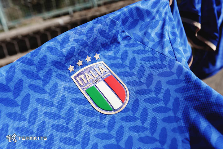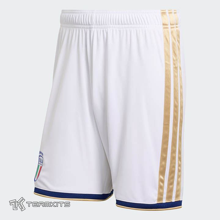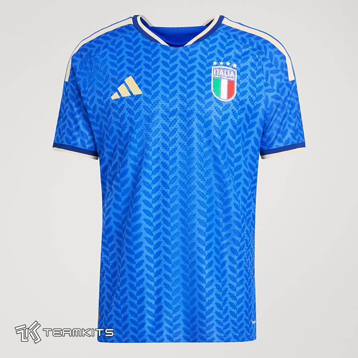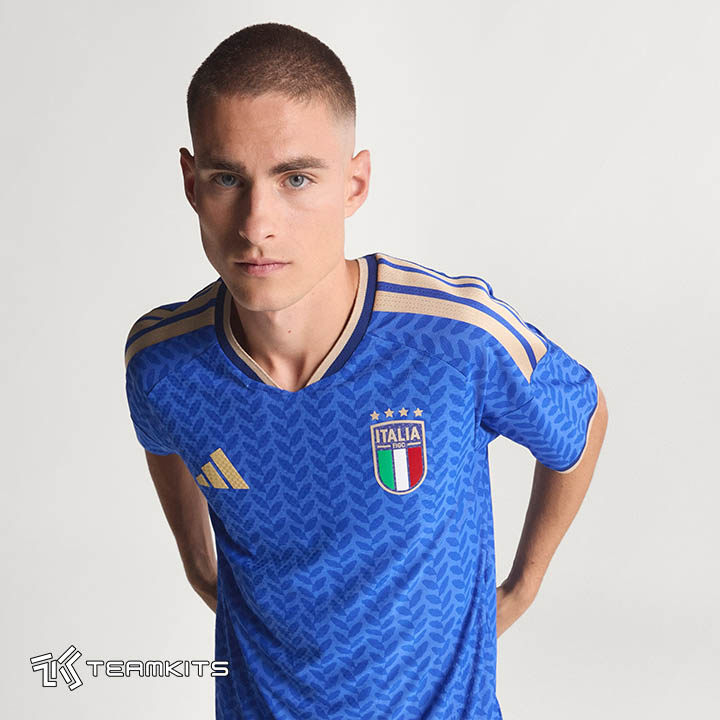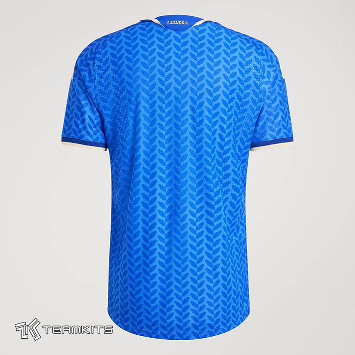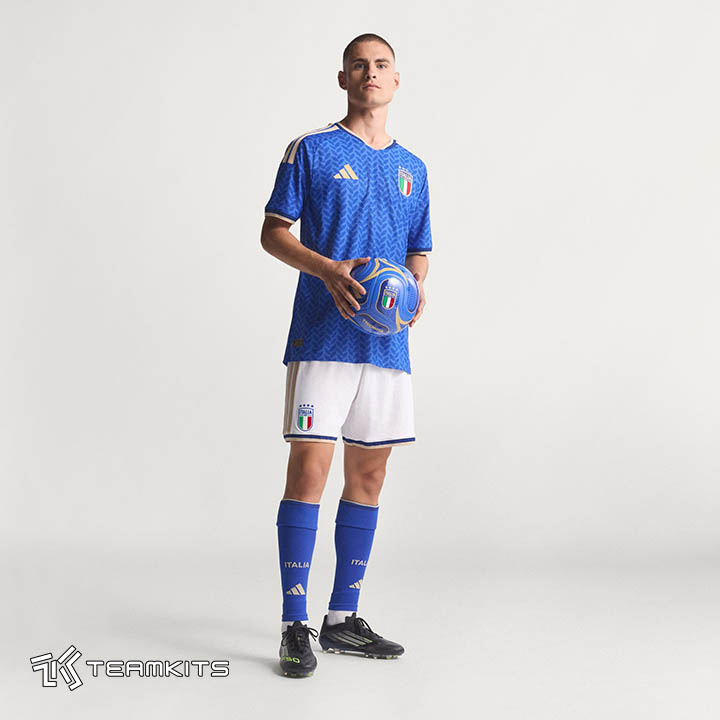 جزئیات سفید لوگوی تیم ملی ایتالیا به طلایی روشن تغییر رنگ داده و عبارت “AZZURRA” نیز در پشت یقه نوشته شده است. شورت سفید و جوراب آبی ترکیب لباس اول ایتالیا در سال ۲۰۲۶ و ۲۰۲۷ و احتمالا جام جهانی ۲۰۲۶ را کامل می کند.