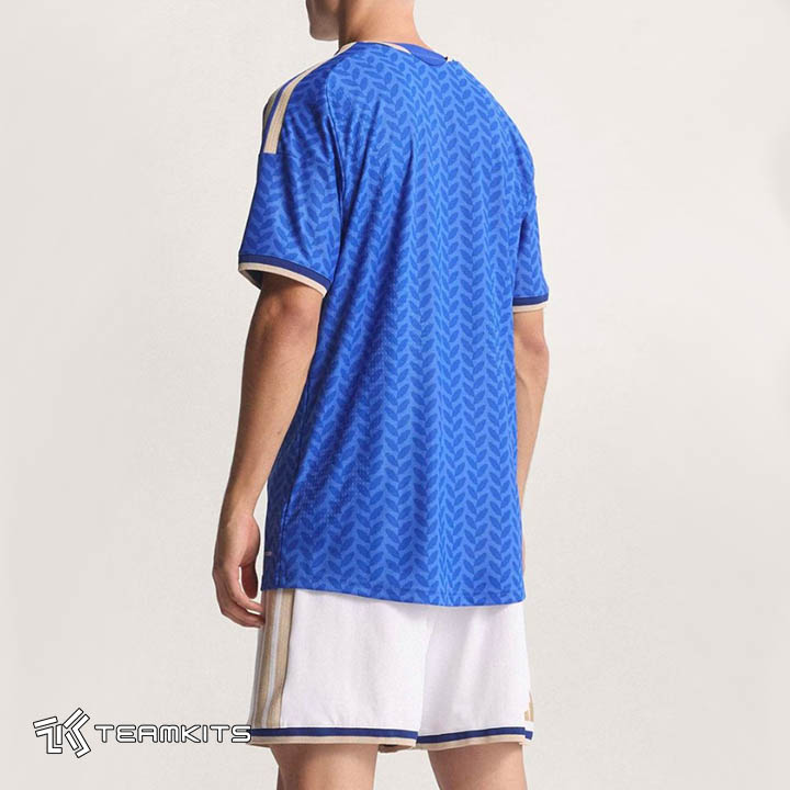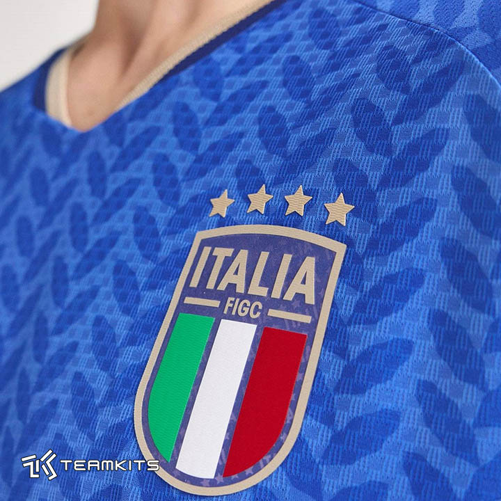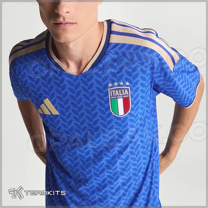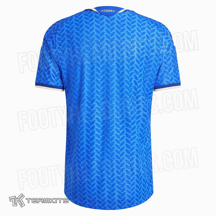 جزئیات سفید لوگوی تیم ملی ایتالیا به طلایی روشن تغییر رنگ داده و عبارت “AZZURRA” نیز در پشت یقه نوشته شده است. شورت سفید و جوراب آبی ترکیب لباس اول ایتالیا در سال ۲۰۲۶ و ۲۰۲۷ و احتمالا جام جهانی ۲۰۲۶ را کامل می کند.