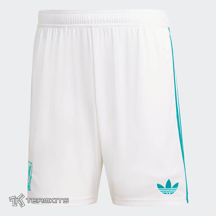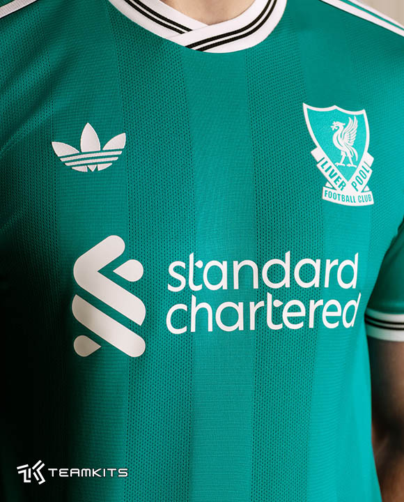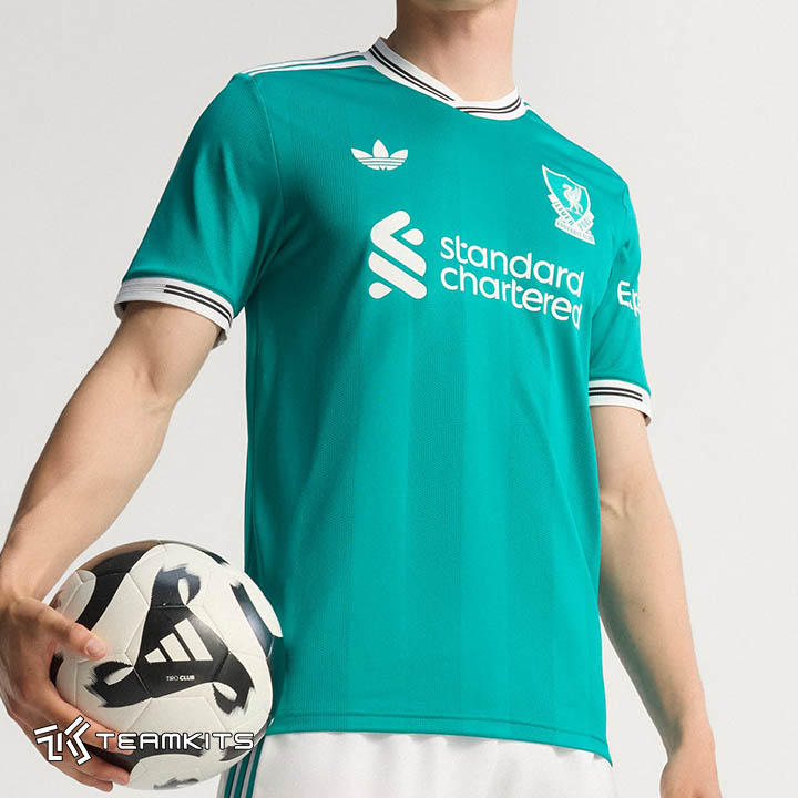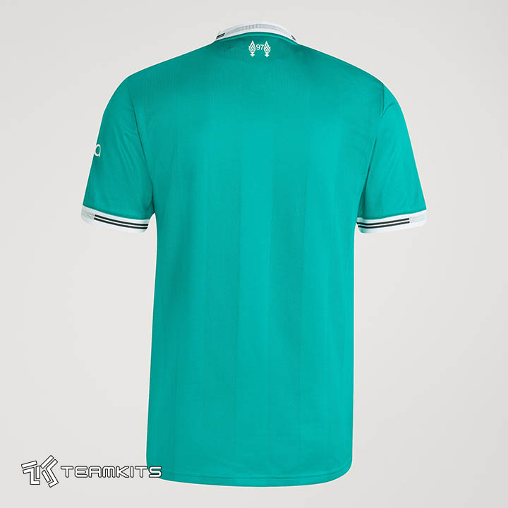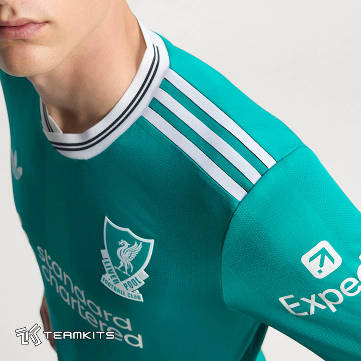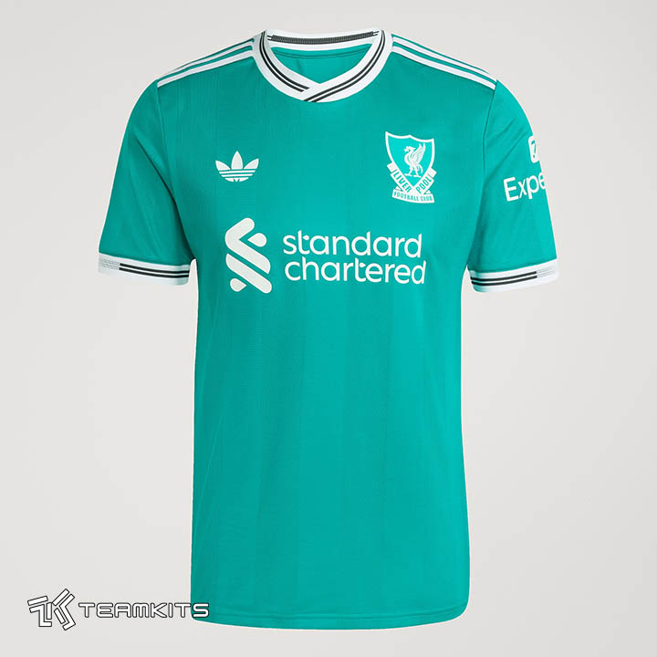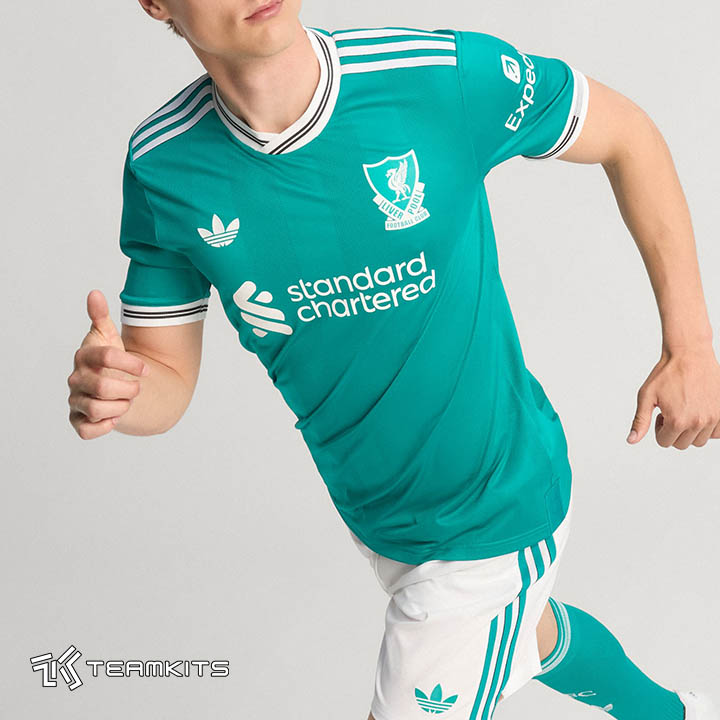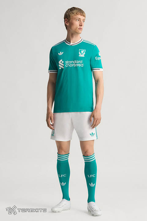 برای این لباس از فرم مدرنیزه یکی از لوگوهای قدیمی باشگاه لیورپول که در بازه سال های ۱۹۸۷ تا ۱۹۹۲ مورد استفاده قرار می گرفت بهره برده شده است. یقه و نوار لبه آستین سفید با دو خط باریک بر روی آن به همراه شورت سفید و جوراب سبز دریایی ترکیب لباس سوم لیورپول در فصل ۲۰۲۶-۲۰۲۵ را کامل می کند.
