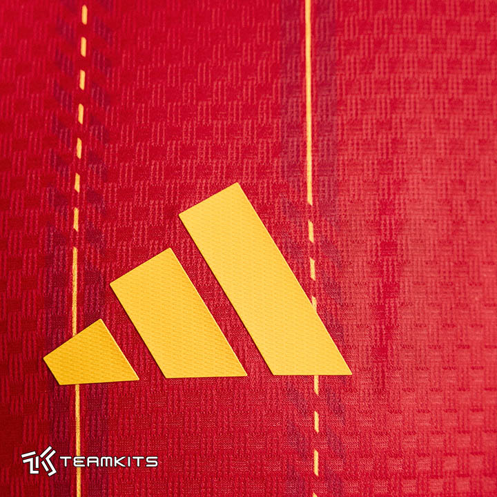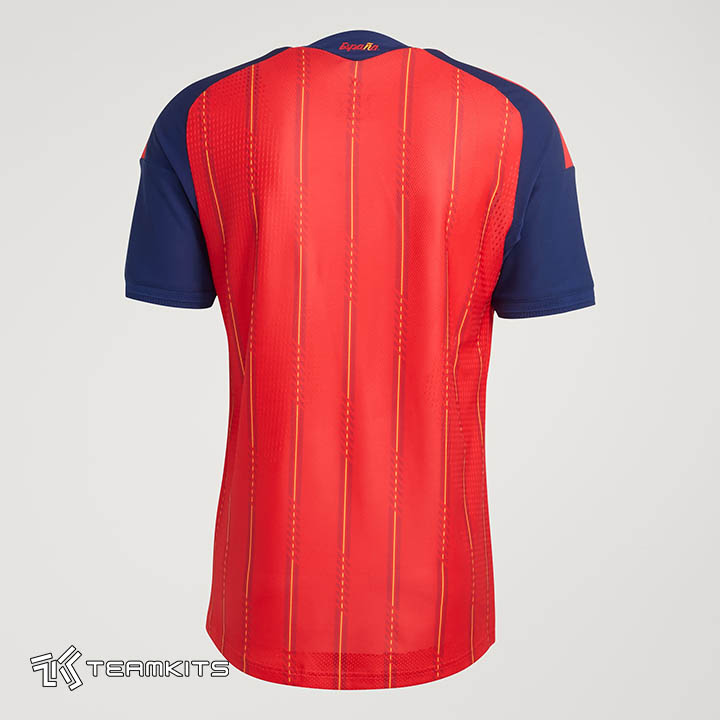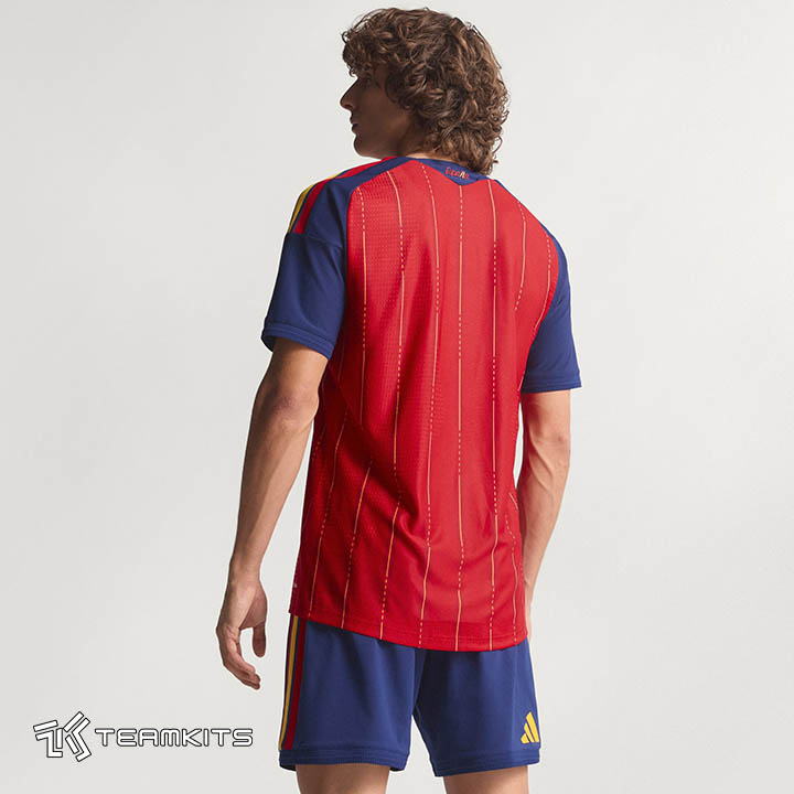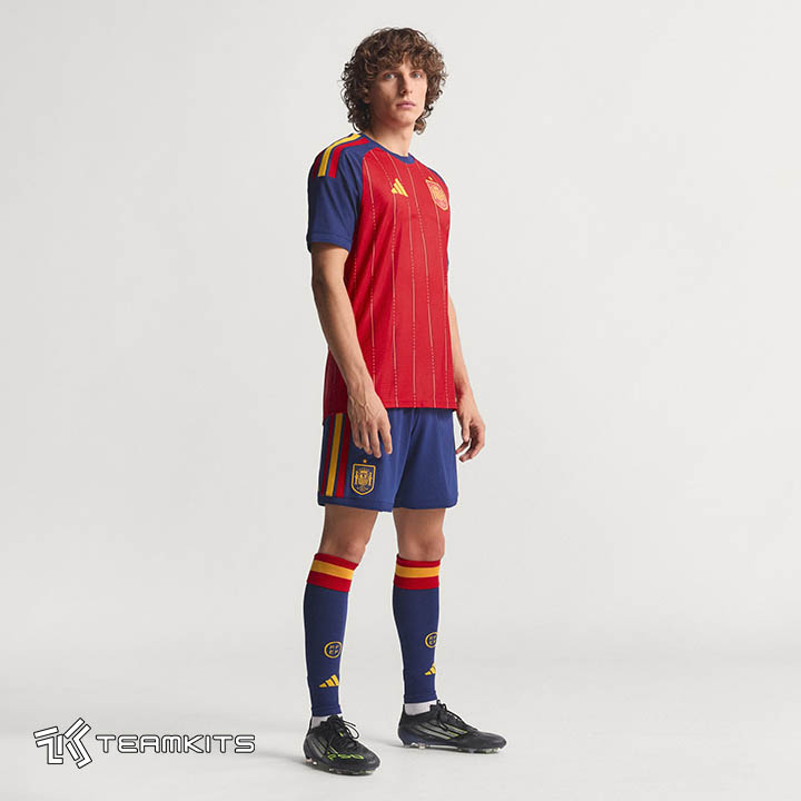 سه خط ضخیم آدیداس بر روی شانه ترکیب رنگ پرچم اسپانیا(قرمز، زرد، قرمز) را به نمایش می گذارد و نام کشور “España” نیز در پشت یقه نوشته شده است. شورت و جوراب سرمه ای با جزئیات قرمز و زرد ترکیب لباس اول اسپانیا در سال ۲۰۲۶، ۲۰۲۷ و همچنین جام جهانی ۲۰۲۶ را کامل می کند.