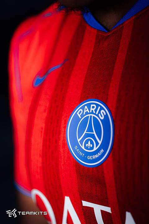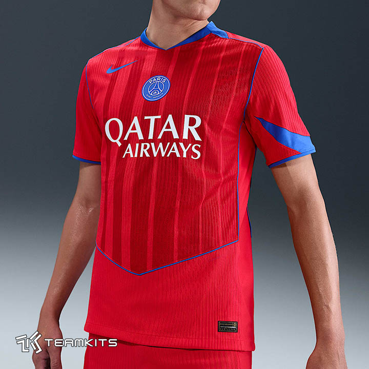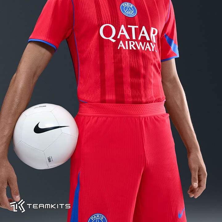 نوارهای عمودی محو در محدوده جلوی پیراهن به چشم می خورد و لوگوی باشگاه پاریسن ژرمن با ترکیب آبی و سفید، لوگوی نایک در گوشه بالا به رنگ آبی و اسپانسر(QATAR AIRWAYS) نیز سفید هستند. شورت و جوراب قرمز با جزئیات آبی ترکیب لباس سوم PSG در فصل ۲۰۲۶-۲۰۲۵ را کامل می کند.